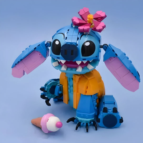 Assemblez votre propre Stitch assis, aux grandes oreilles caractéristiques et aux couleurs éclatantes : bleu vif, rose tendre et orange chaleureux.
