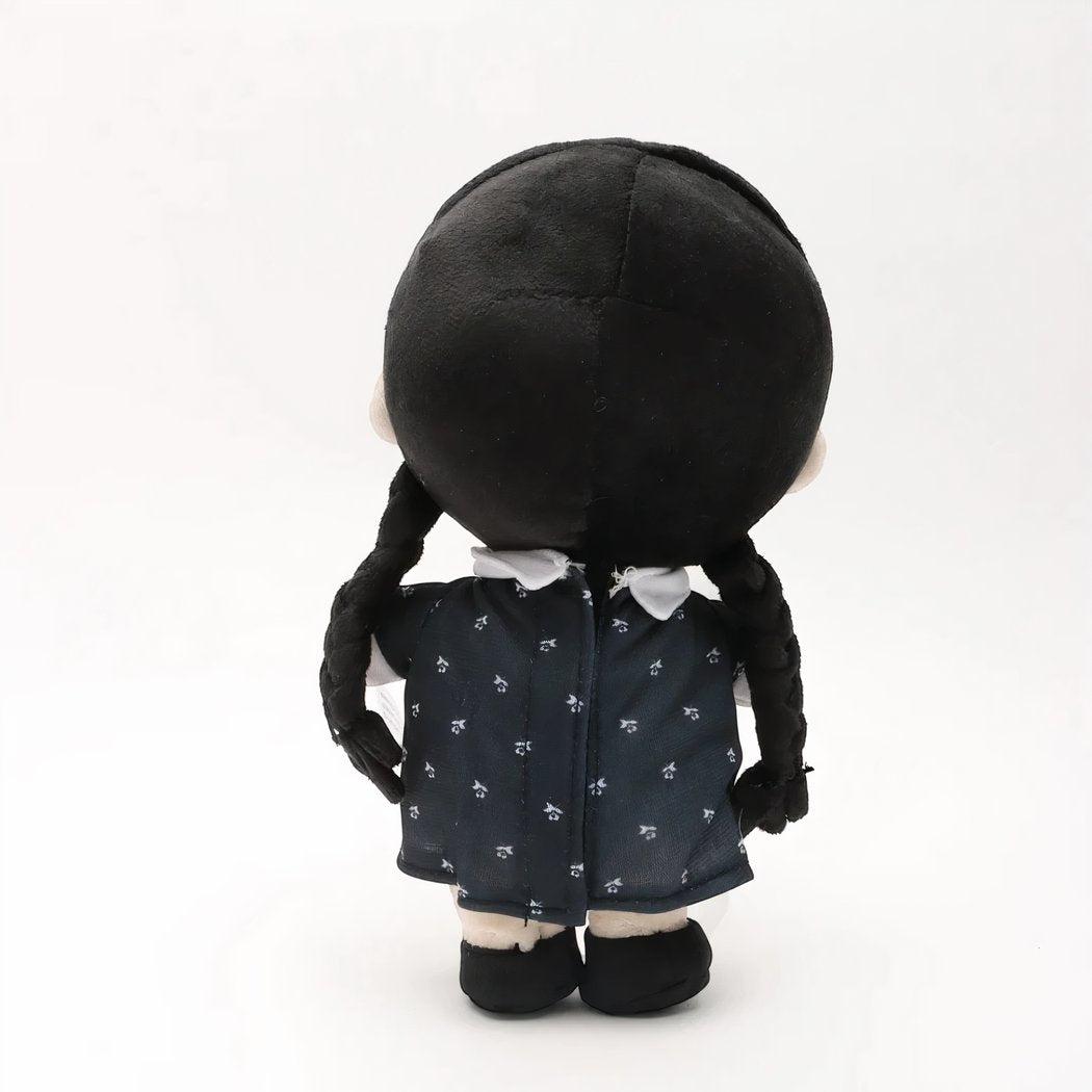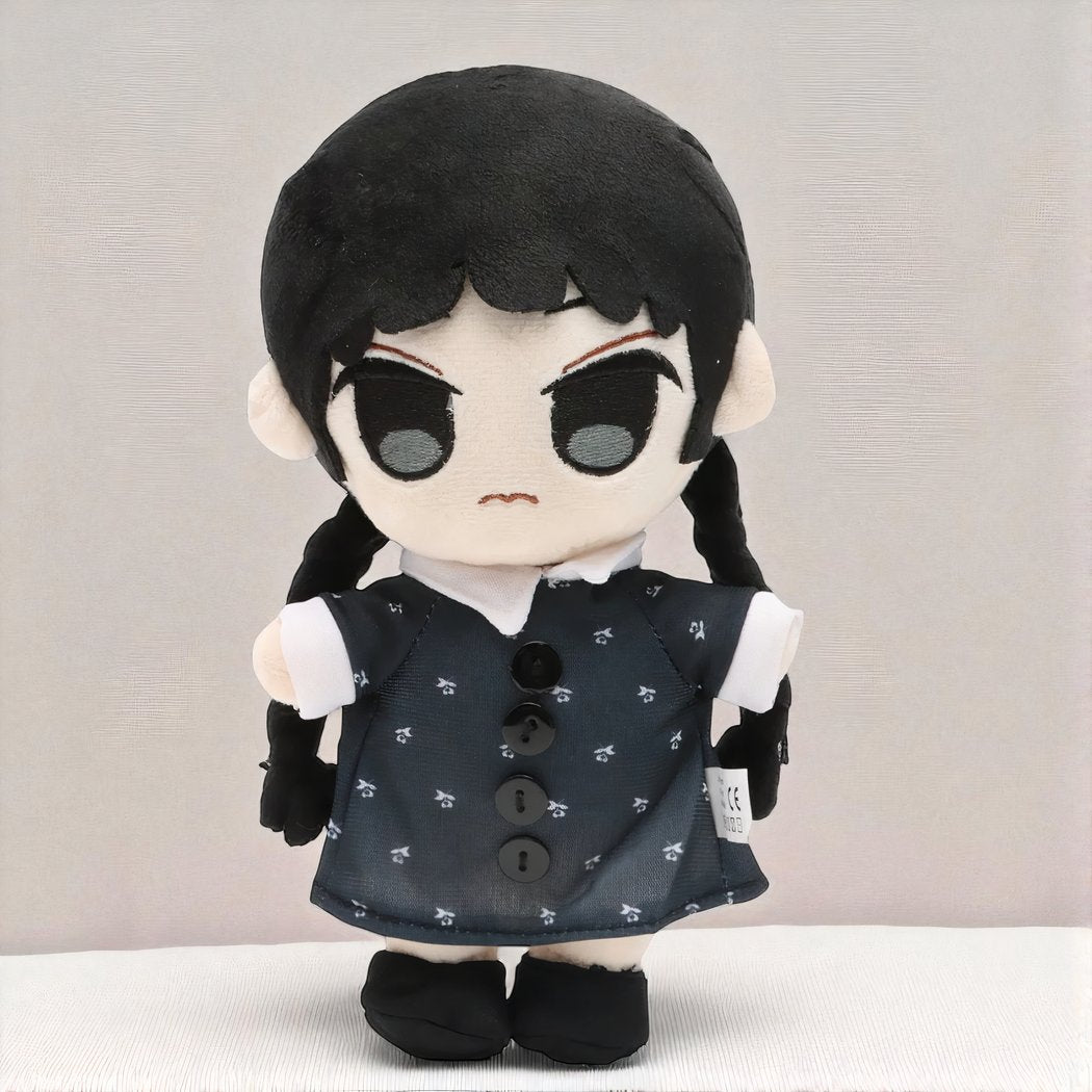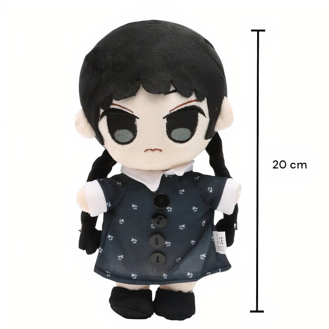 Découvrez la Peluche Mercredi Addams en robe noire à fleurs, une compagne douce et originale pour les nuits et les jeux.