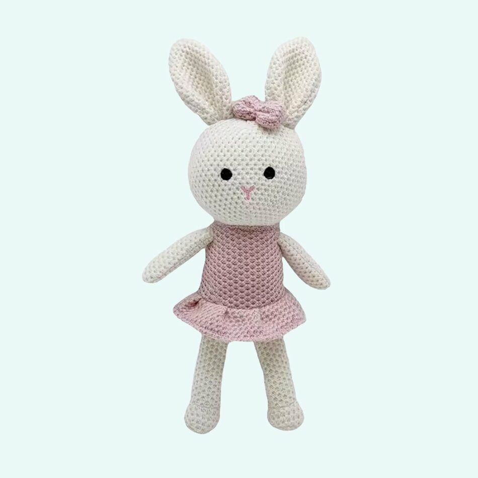 Découvrez la Peluche crochet mademoiselle lapin, un jouet doux et irrésistible pour bébé.